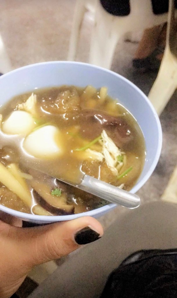 Nodding in unison with my sister, my belly let out a groan, reminding me the whole reason I even embarked on this journey. Within moments two of the young girls that had previously been laughing and talking stood in front of us with trays of a large bowl of steaming soup and a drink. Bowing in gratitude, they bowed back. The soup bowl was filled with a broth and variety of ingredients we couldn’t make out. This was not the Thai food I was accustomed to but as Andrew Zimmern always says ‘If it looks good, eat it’.